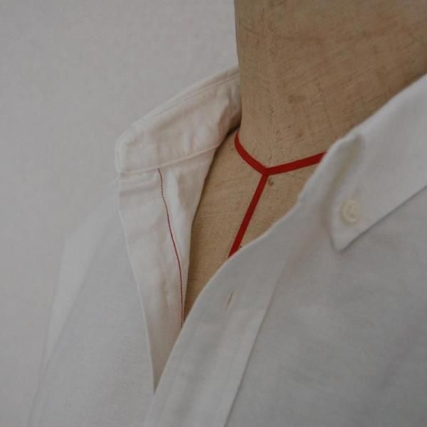 小ぶりなボタンダウンカラーと裏側の赤い耳使いがポイント。